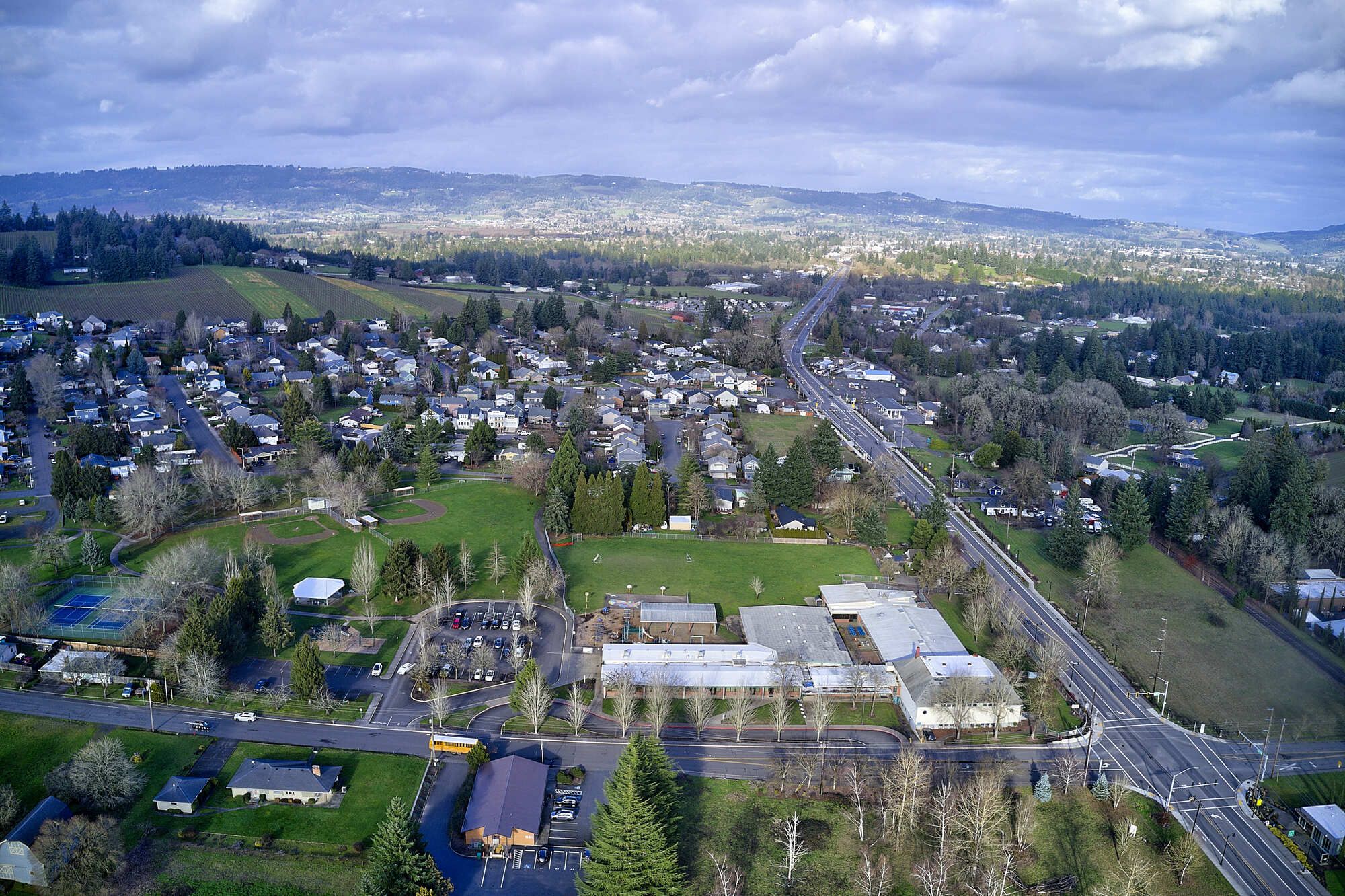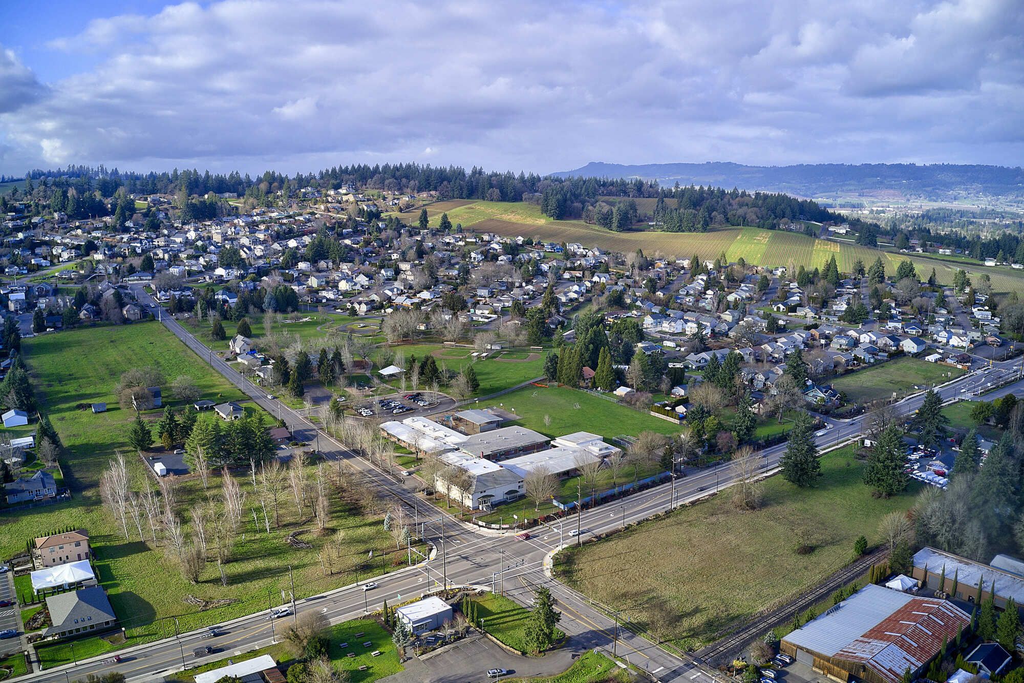 This 4.47-acre parcel is one of the largest available for sale in Downtown Dundee, Oregon. It is prominently located at the intersection of Highway 99W and 5th Street, near new and planned development projects. The property is surrounded by civic amenities, including Billick Park, the Post Office, and City Hall. The existing elementary school building has been well maintained and presents an opportunity for similar use or adaptive reuse. Alternatively, the property could be developed into a variety of different uses. The City of Dundee is supportive of new zoning and development that aligns with its downtown vision. Currently zoned for single-family residential (R-1), a zone change to CBD is supported by the City of Dundee. The property is located at the entrance of Dundee, the gateway to Oregon's wine country.