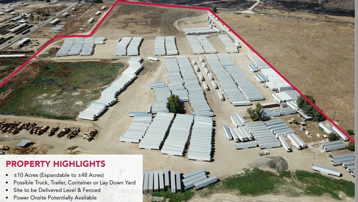 This property offers 10 acres of land, expandable to 48 acres, suitable for lease. It is located at the southwest quadrant of Gilman Springs Road and Knoch Road. The site is to be delivered level and fenced, with a private entrance. The property is potentially suitable for use as a truck, trailer, container, or lay-down yard. Power is potentially available onsite.