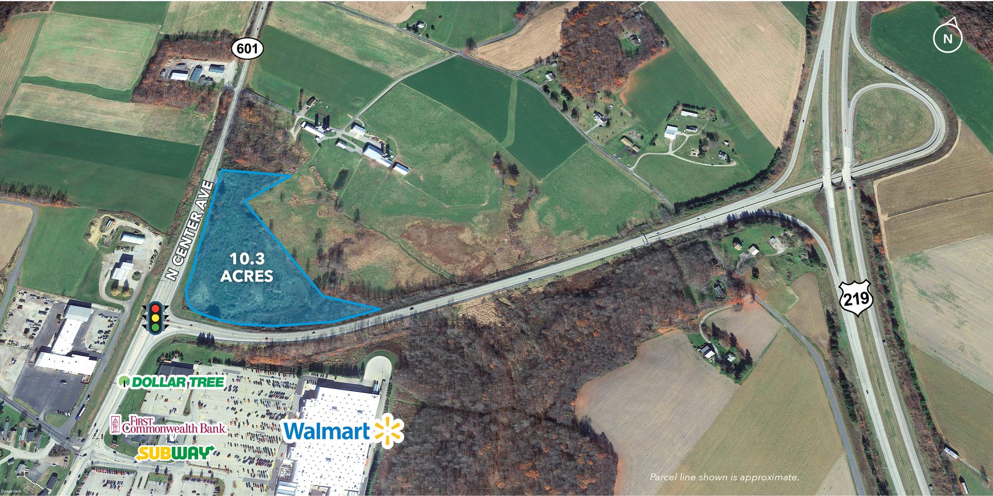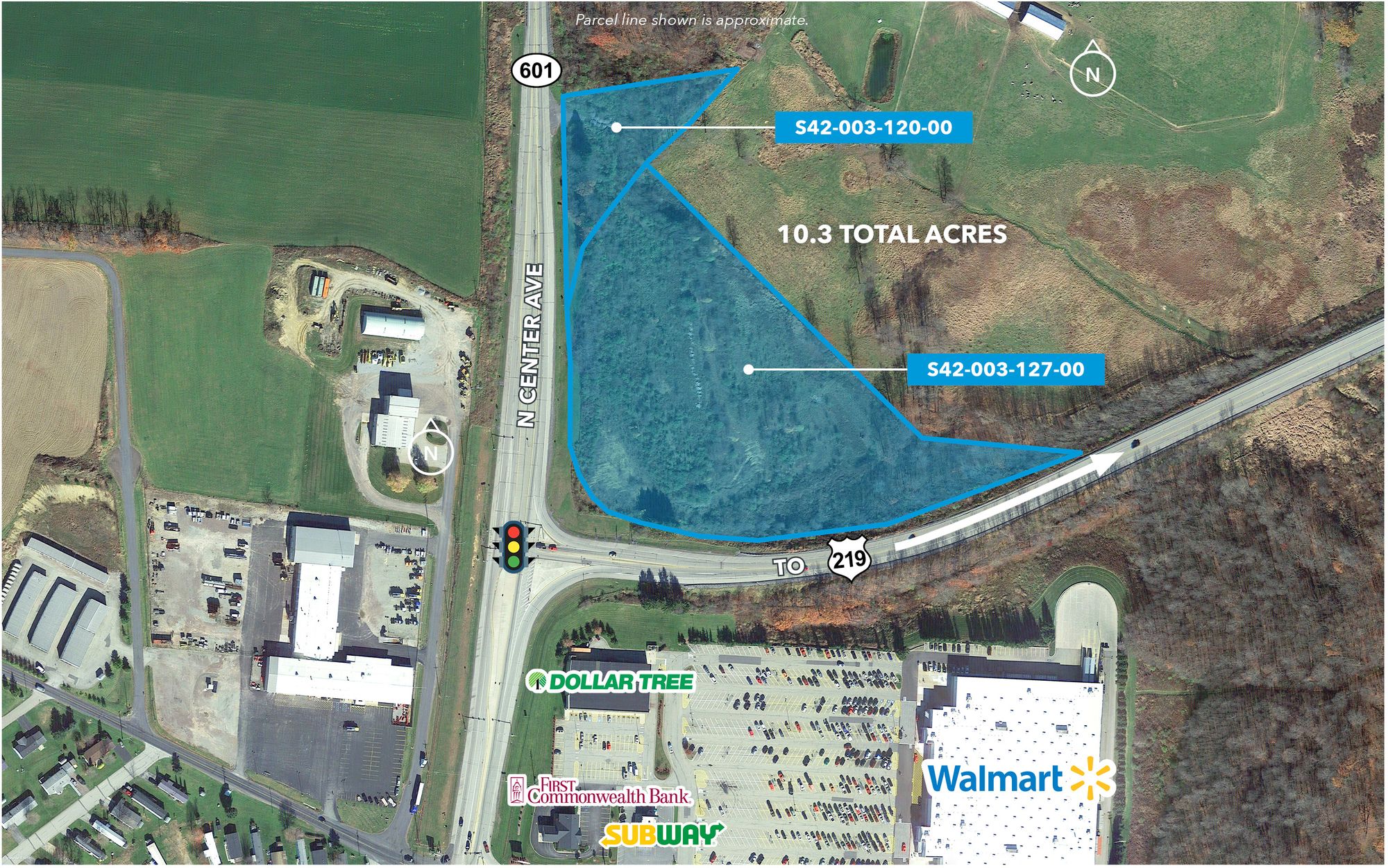 10.3 acres at signalized intersection, ideal for development.