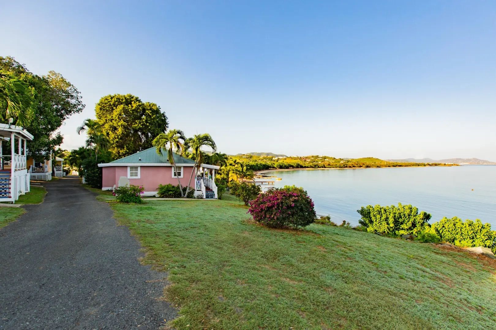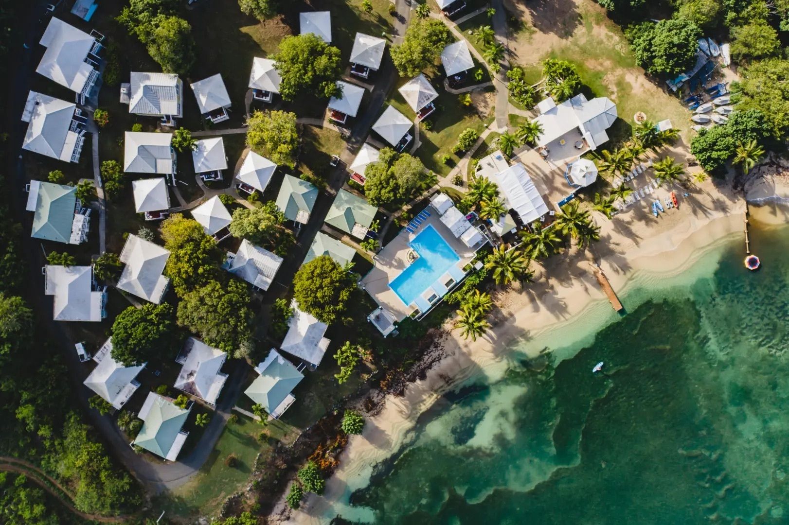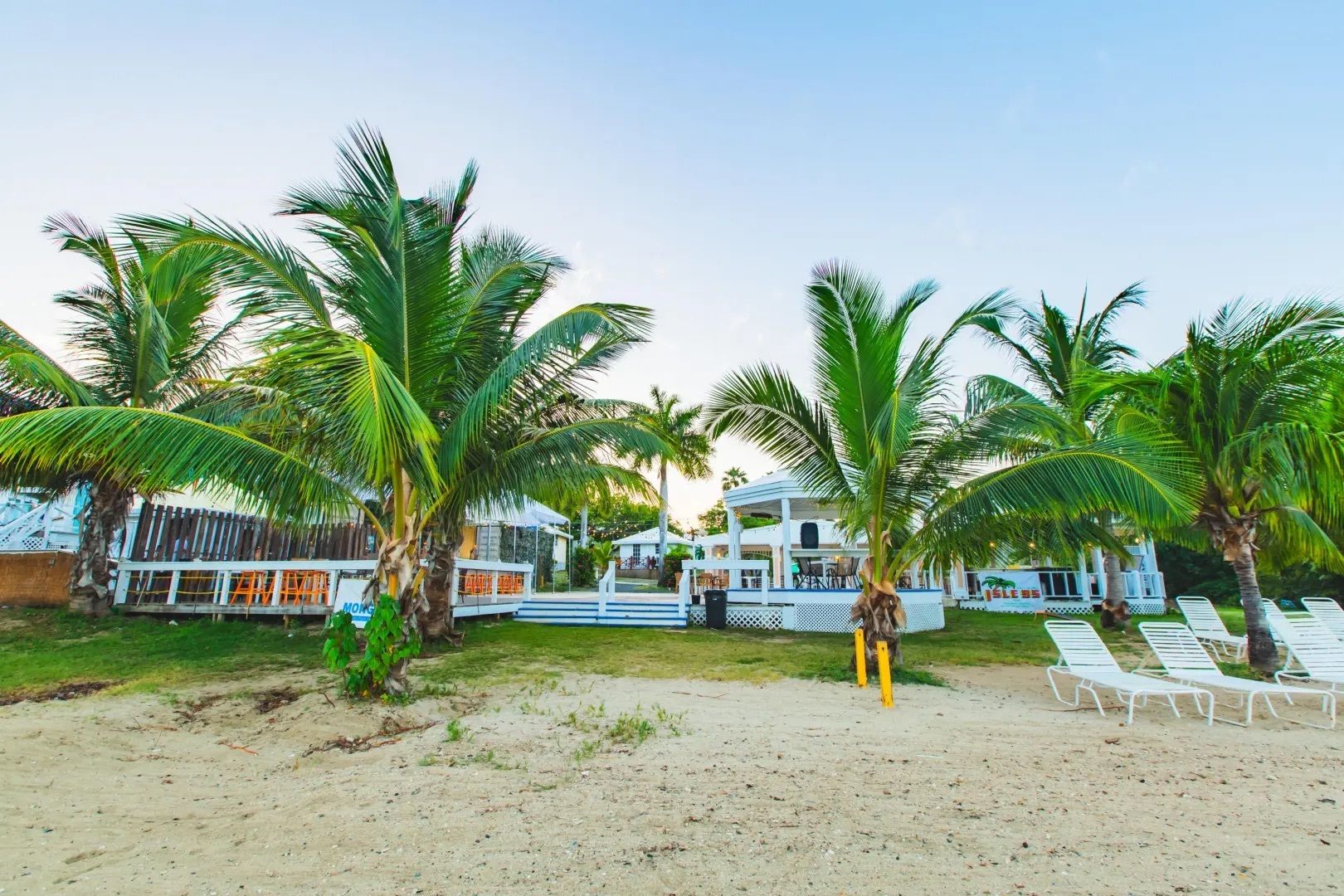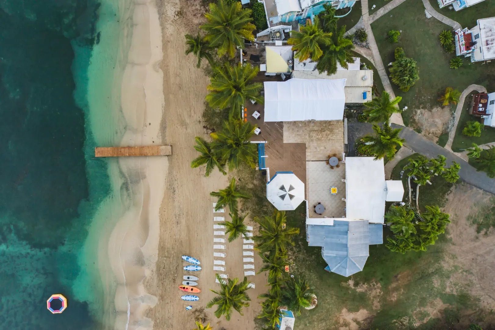 This property features: Beachfront bar and restaurant with gazebo seating.; 50 island‑style cottages on a gentle hillside with white sandy beach.; Additional acreage for development (cottages, hotel rooms, condos, or single‑family homes).