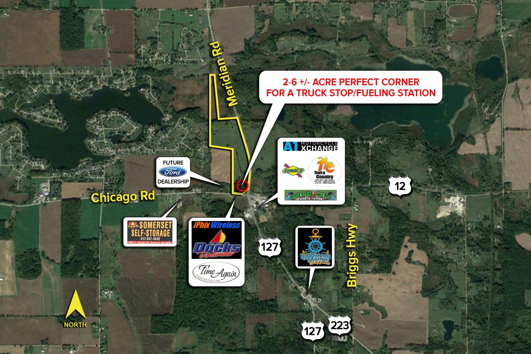 Corner lot suitable for truck stop or fueling station.