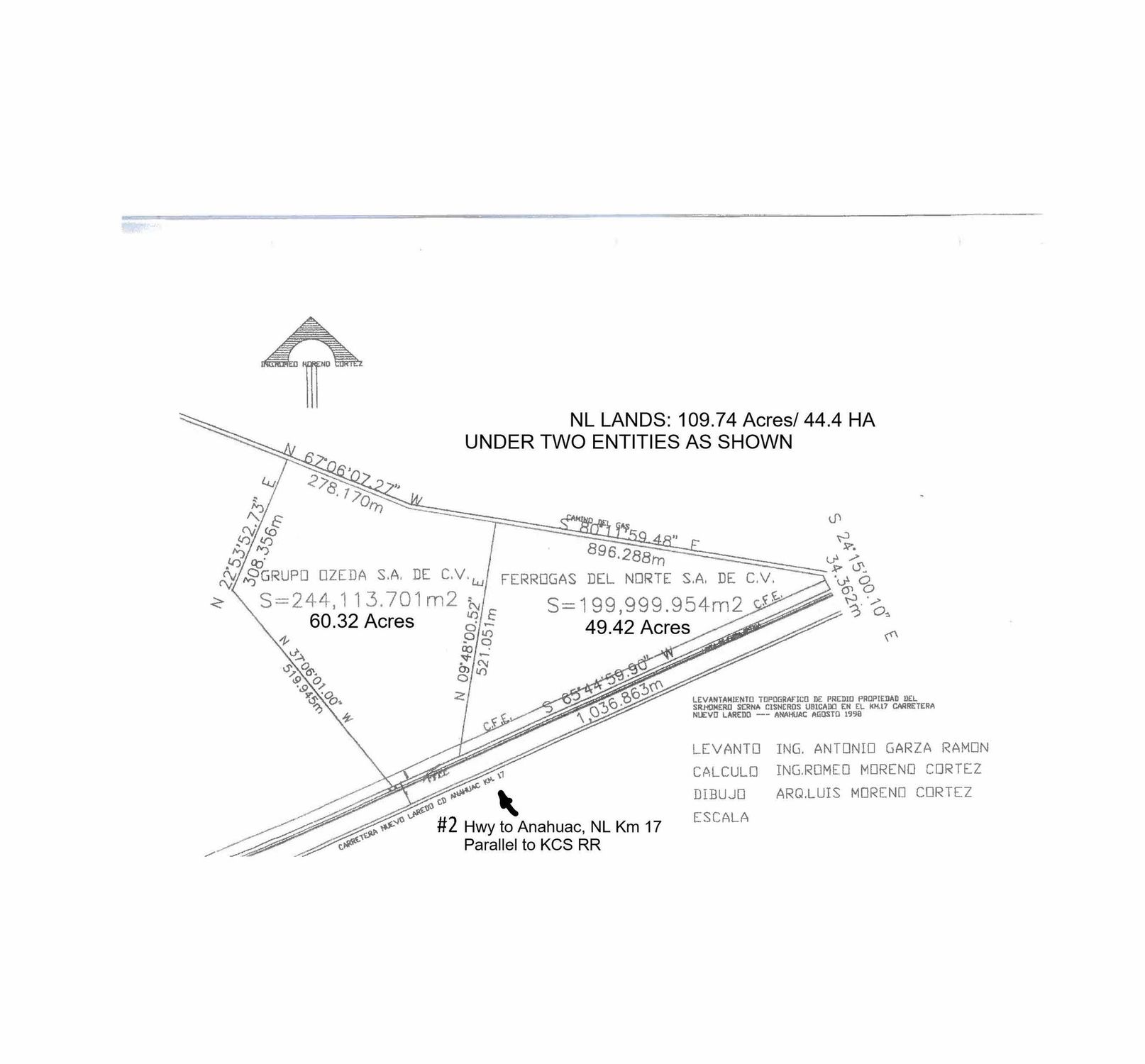 Located 4.5 kilometers north of Highway #2, the property intersects with Highway #1, which leads west to the International Bridge. Adjacent to this intersection is an industrial area with two significant urbanizations of industrial warehouses: Oradel Industrial Park and Campanero Industrial Zone. The Kansas City Southern Mexico rail line runs south of Nuevo Laredo at KM 17 of the Nuevo Laredo to Anahuac, Nuevo Leon Highway #2. The west-most point of the Ferrogas site is located 0.75 kilometers south of KCSM Sanchez Switching Yard. There is a PEMEX PL right-of-way on the north edge of the property.