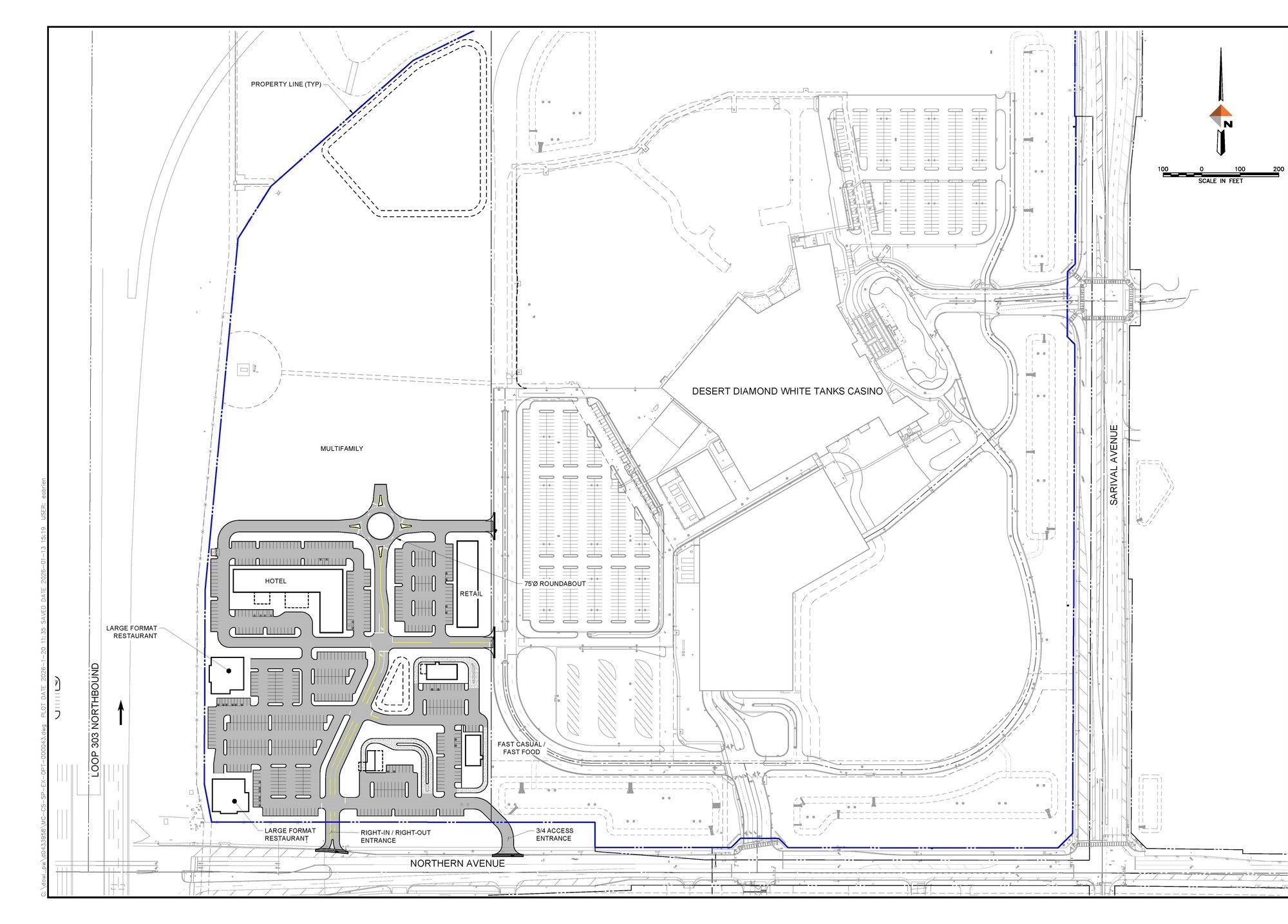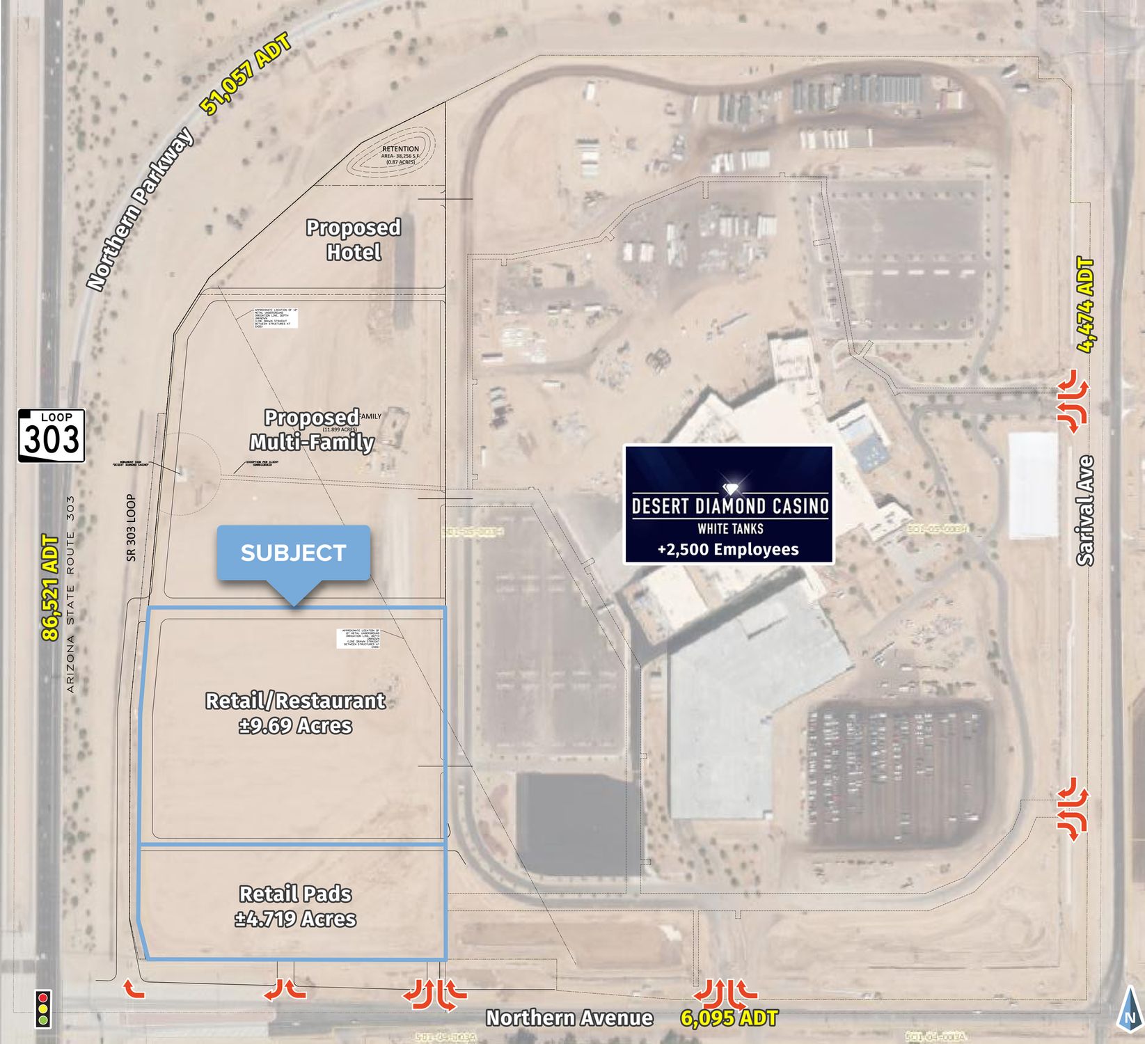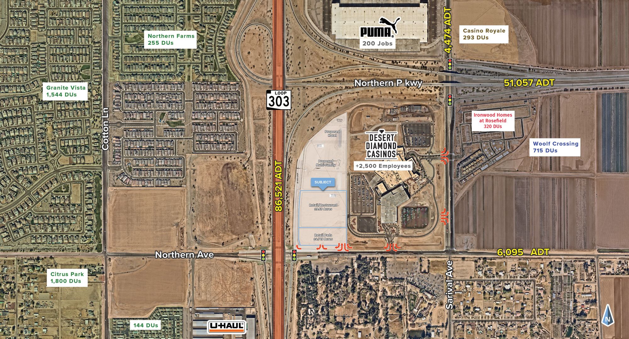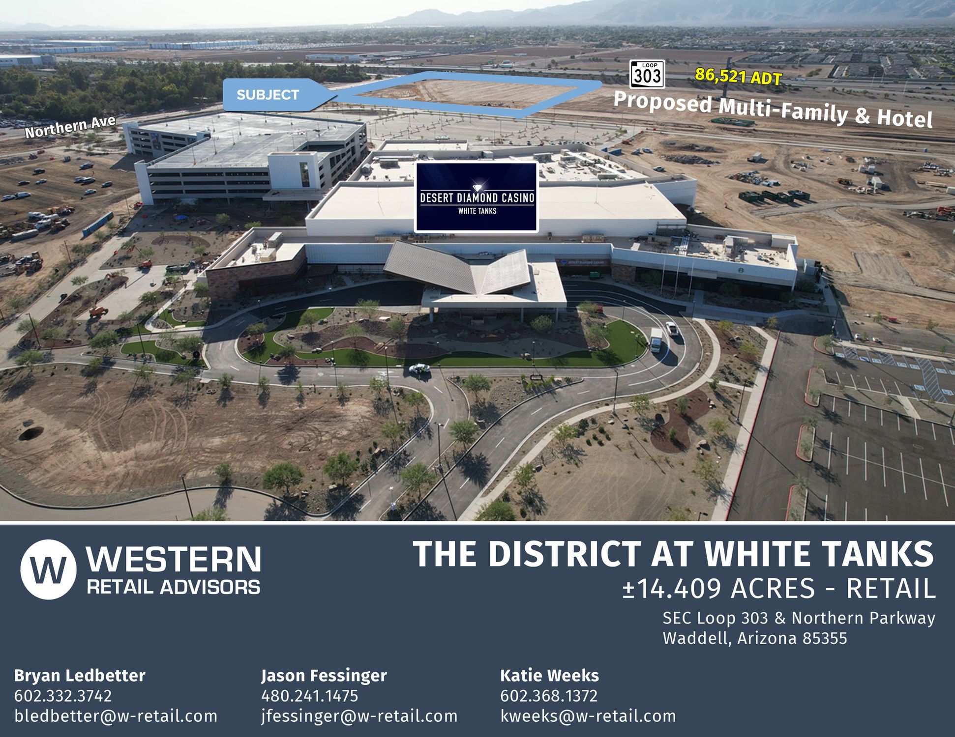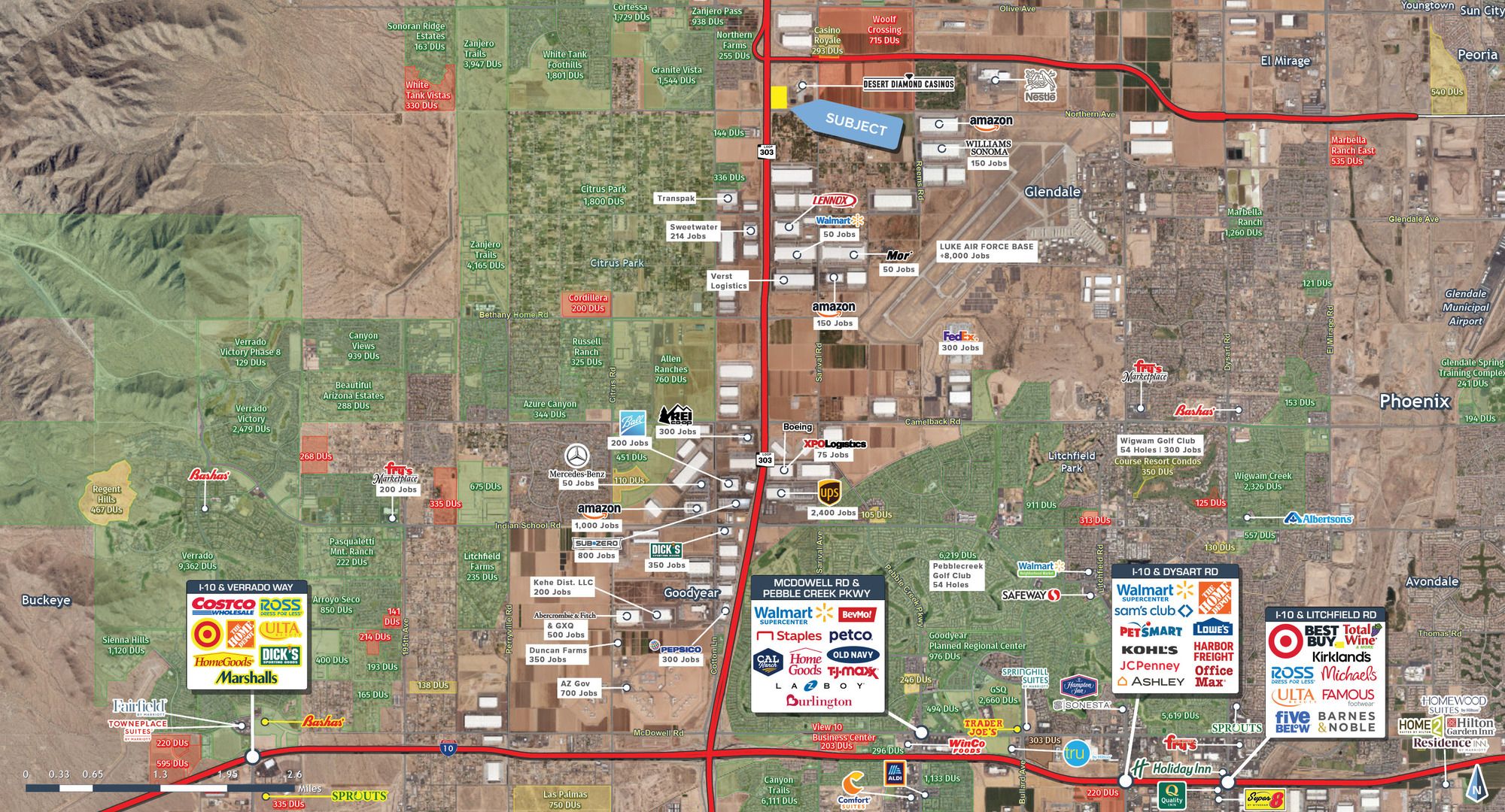 This property features: Located at the Loop 303 & Northern Parkway, a high‑traffic intersection.; Gateway to the $450 million Desert Diamond Casino White Tanks, projected to generate over 1,000 permanent positions.; Adjacent to the 215‑acre Wildlife World Zoo, Aquarium & Safari Park, attracting approximately 500,000 visitors annually.