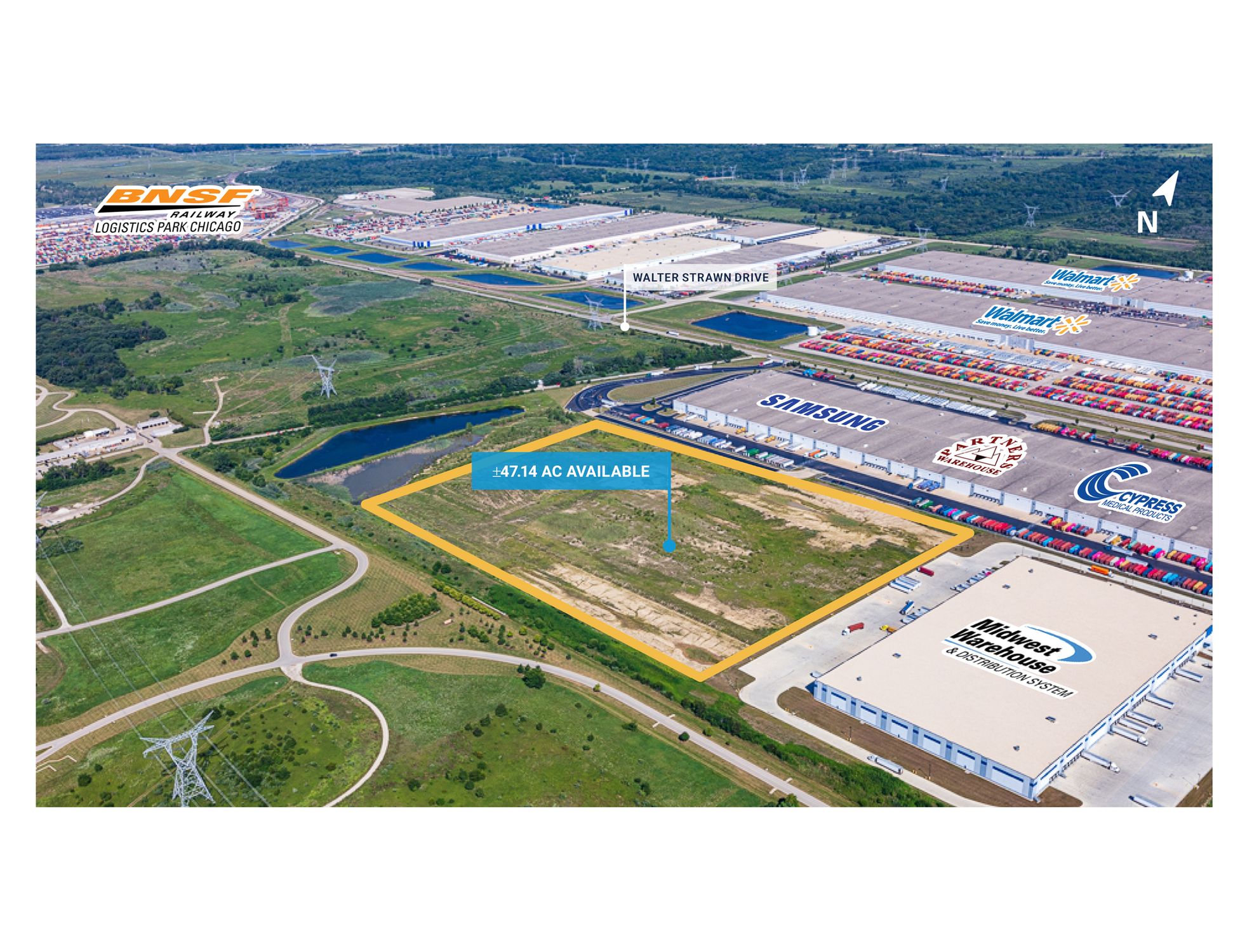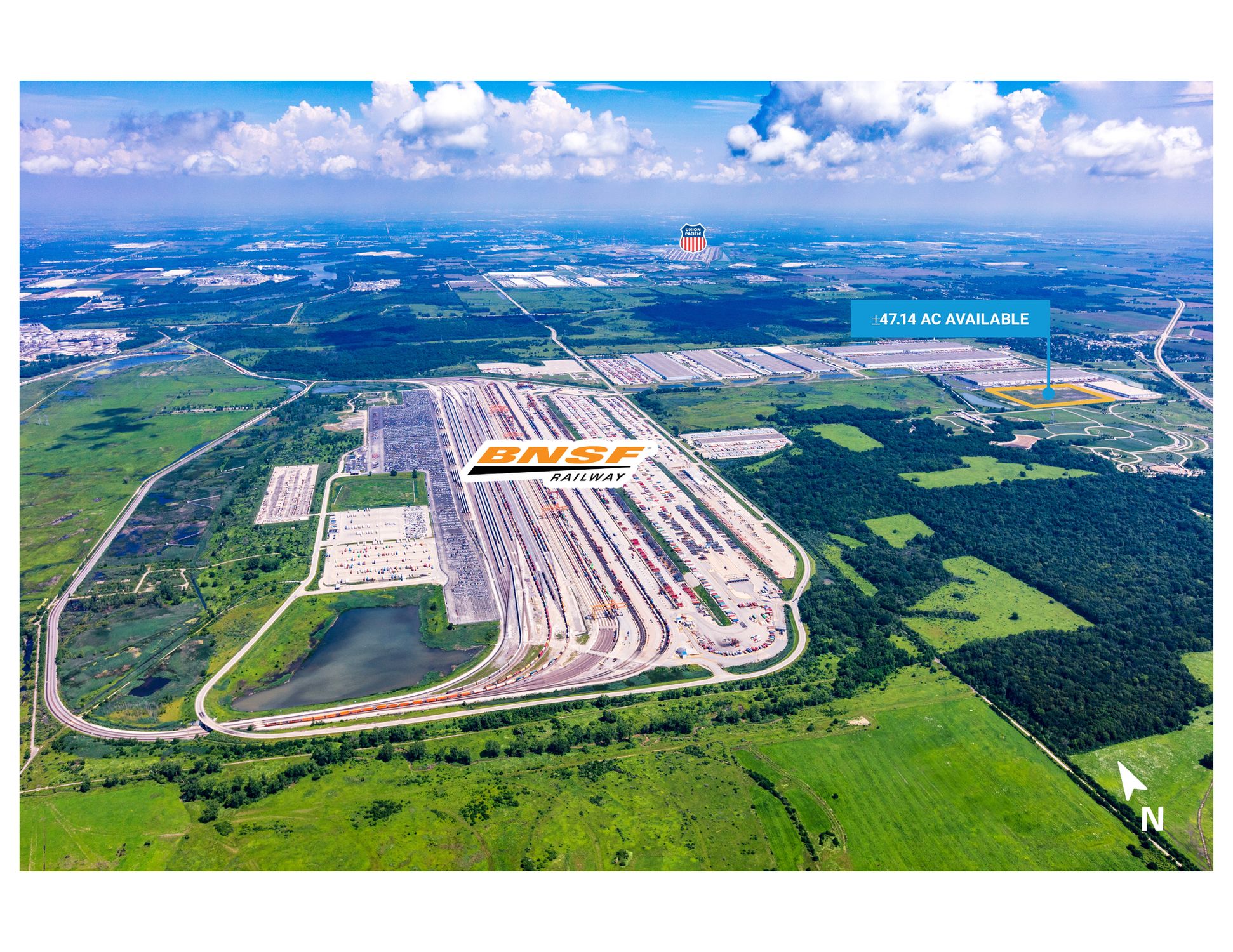 This property features: 47.14 acres of land suitable for development; Building capabilities up to 1 million square feet; Direct rail‑served via the BNSF